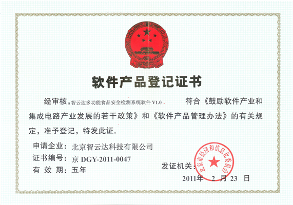 軟件產品登記證書——智云達多功能食品安全檢測系統軟件V1.0