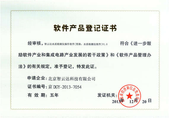 軟件產(chǎn)品登記證書——智云達水質(zhì)檢測儀操作軟件