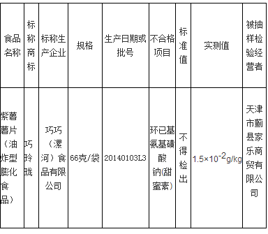 經(jīng)檢測(cè),標(biāo)稱巧巧(漯河)食品有限公司生產(chǎn)的一個(gè)批次“巧玲瓏” 紫薯薯片(油炸型膨化食品)(66克/袋 20140103L3)環(huán)已基氨基磺酸鈉(甜蜜素)超標(biāo),標(biāo)準(zhǔn)要求不得檢出,實(shí)測(cè)值為“1.5×10-2g/kg”。