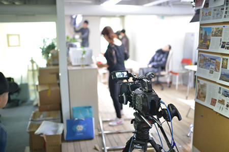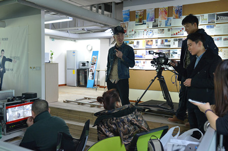 視頻拍攝現場,工作人員分工明確,機械調試、場景布置、演員妝容已全部準備完畢。大家在輕松愉悅的環境氛圍下拍攝,不時互說想法,時而突發靈感動作改進,拍攝現場氣氛活躍。