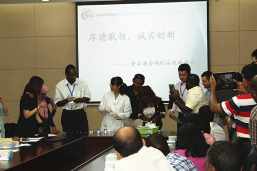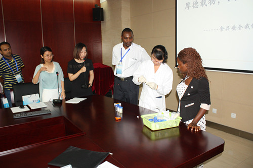 技術人員邀請訪問團友人一起動手實際操作,親自體驗快檢產品操作便捷、測定時間短、檢測結果易于分辨的優勢。