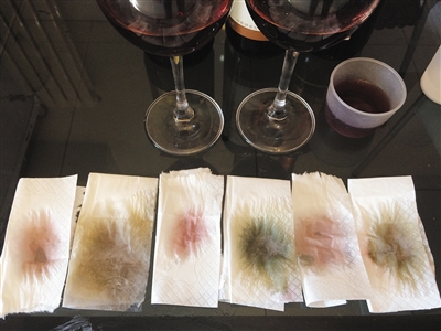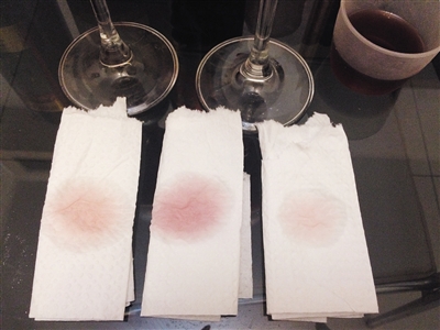 隨后,分別取3滴左右紅酒,滴在鋪平整的白色餐巾紙上,并觀察紅酒液體在餐巾紙上的擴(kuò)散情況。
