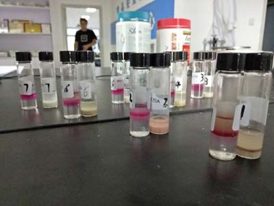 顯色劑的準(zhǔn)備之后,取八份樣品,取一支試劑A,將所取樣品加入管中,蓋緊蓋子,充分震蕩混勻,靜置幾分鐘,使上層液澄清;然后用0.5mL吸管吸取試劑A瓶中上層溶液約一半的量至試劑B瓶中;蓋緊B蓋塞子,上下翻轉(zhuǎn),使其混合,靜置至清晰分層;另取一支0.5mL 吸管,吸取試劑C至吸管細(xì)部前端約1/4 處,插入至試劑B瓶的下層溶液中并緩慢排空,觀察B瓶下層溶液中是否產(chǎn)生渾濁絮狀物或沉淀物。
