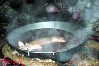 在查獲現場,記者看到違法人員臨時搭建的私宰帳篷里,地上鋪滿了豬血和豬毛的混合物,生豬糞便隨著水流漸漸形成一條“小河”流向遠處,殺豬刀、鐵鉤、鐵叉等用于私宰的工具隨意擺放在地上,與豬毛、豬血、糞便等混合在一起,現場一口直徑近2米的大鍋盛滿了水,熱氣騰騰。深圳市市場稽查局食品稽查處的執法人員告訴記者,這口大鍋是用來給生豬褪毛的,隨后就在骯臟的環境下進行屠宰和分割、裝填貨車,這樣的豬肉其質量可想而知。