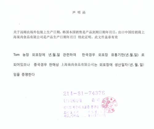 12月20日,1號(hào)店方面向澎湃新聞?dòng)浾哒f明,韓國廠家確認(rèn)了國內(nèi)經(jīng)銷商的說法,出口巢尚食品的湯姆農(nóng)場產(chǎn)品外包裝所標(biāo)日期為生產(chǎn)日期,并出具了說明函。