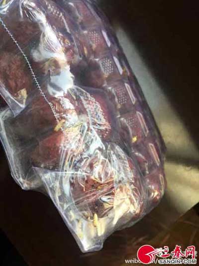 記者從該網(wǎng)友提供的照片看到,消費(fèi)者稱里面有蟲子的大棗品牌為“北方谷雨”狗頭棗,系陜西北方谷雨特產(chǎn)食品有限公司生產(chǎn)。透過透明包裝袋可以清楚的看到,數(shù)條白色的“蛆蟲”趴在大棗上。微博網(wǎng)友@淉淉7號告訴記者,她的同事暫時(shí)還沒有前去超市交涉,但后面肯定要去。