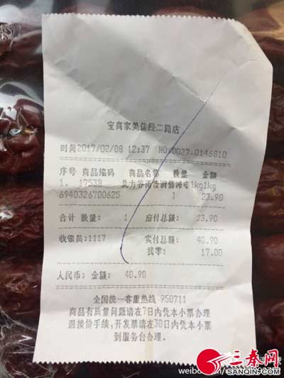 微博網(wǎng)友@淉淉7號在網(wǎng)上投訴稱,同事于2月8日在寶雞家美佳超市經(jīng)二路店購買了一袋大棗,回去后卻發(fā)現(xiàn)里面有很多的蟲子,令人十分惡心。