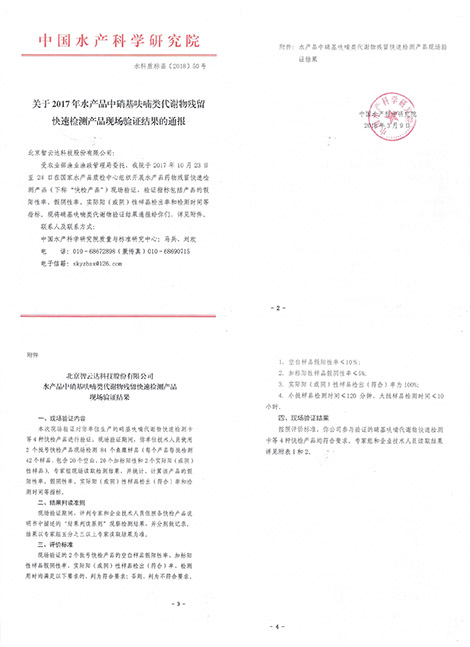 中國(guó)水產(chǎn)科學(xué)研究院質(zhì)量與標(biāo)準(zhǔn)研究中心受農(nóng)業(yè)部漁業(yè)漁政管理局委托 ,運(yùn)用智云達(dá)自主研發(fā)的水產(chǎn)品快檢產(chǎn)品,對(duì)水產(chǎn)品中硝基呋喃類代謝物進(jìn)行快速檢測(cè)。2017年10月23日-24日,該檢測(cè)在國(guó)家水產(chǎn)品質(zhì)檢中心順利開展。驗(yàn)證結(jié)果如下:
