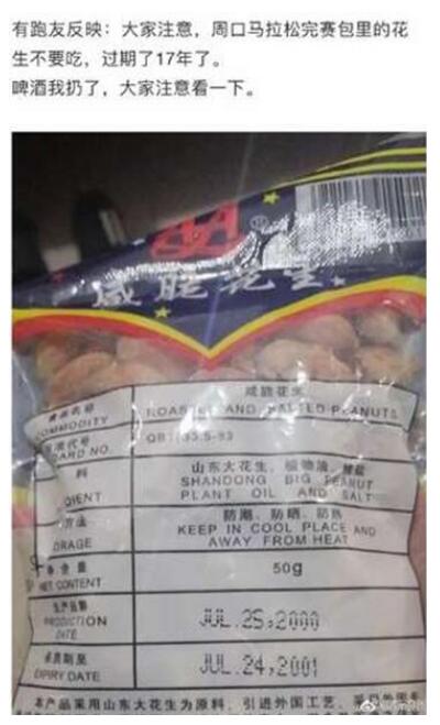 今日,有網(wǎng)友爆料,河南周口馬拉松賽后提供的一包花生,外包裝的生產(chǎn)日期竟然是2000年。北京青年報記者從周口馬拉松組委會了解到,該花生是當?shù)匾焕先顺粗疲臼巧⒀b出售,此次為方便組委會才分袋包裝,生產(chǎn)日期是包裝袋有誤,花生本身沒有問題。