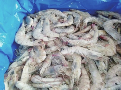 鹽凍白蝦的工藝流程是:蝦塘收蝦,運回工廠,手工分揀,機器分揀,裝籃,過低溫鹵水冷凍凍結(耗時10多分鐘左右)、包裝、出廠銷售。采用低溫鹵水凍結機在短時間內將蝦的中心溫度降低到-17℃~-18℃,使蝦迅速冷凍并在表面結有鹽粒和白霜。其中的鹵水就是高濃度鹽水,各工廠會根據自身的實際情況來調整鹵水的成分和淋浴時間。鹽凍完成后,一些工廠為了滿足中國客戶對毛重的需求,會在蝦盒底部放一些碎冰,將整盒包裝的毛重做到2公斤/盒、凈重為1.8公斤/盒的產品。