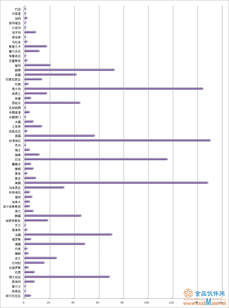 統(tǒng)計顯示,這些食品來自六十多個國家或地區(qū)。其中,意大利、美國、日本這些國家以及臺灣地區(qū)的不合格食品居多,尤以臺灣地區(qū)的最多。