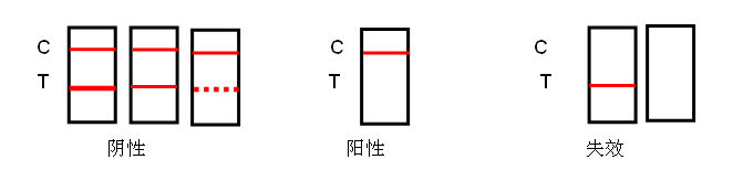 無效反應(yīng):C線不顯色,無論T線是否顯色,該檢測卡均判為無效。未出現(xiàn)C線,表明操作過程不正確或檢測卡已變質(zhì)失效。在此情況下,應(yīng)再次仔細(xì)閱讀說明書,并用新的檢測卡重新測試。