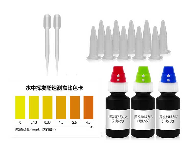 2. 取待測水樣1mL于1.5mL離心管中,滴加2滴揮發(fā)酚試劑A,混勻,再滴加1滴揮發(fā)酚試劑B,搖勻,再滴加1滴揮發(fā)酚試劑C,搖勻,開蓋自上而下觀察顏色,和色卡對比。