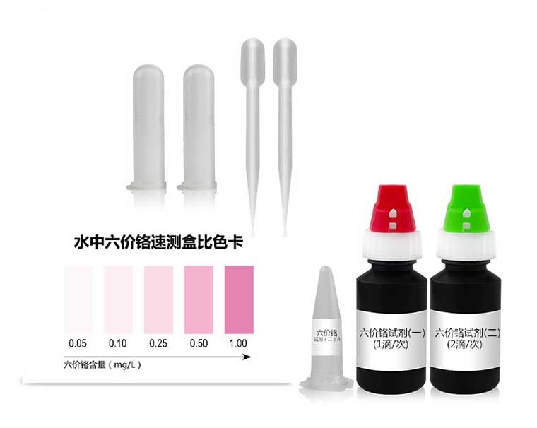 鉻(Cr)在其化合物中常見的價態有三價(Cr3+)和六價(Cr6+)兩種。六價鉻為吞入性毒物/吸入性極毒物,皮膚接觸可能導致過敏;更可能造成遺傳性基因缺陷,吸入可能致癌,對環境有持久危險性。其毒性比三價鉻高100 倍,且更易被人體吸收,在體內蓄積,對人體造成危害。本速測盒適用于生活飲用水及其水源水中六價鉻的快速檢測。