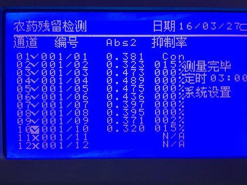 檢測結(jié)果如圖所示,結(jié)果以酶被抑制的程度,即抑制率表示。當果蔬樣品提取液對酶的抑制率為40~50%時,則表明被測樣品為可疑農(nóng)殘超標樣品;當抑制率≥50%時,表示蔬菜中有高劑量有機磷或氨基甲酸酯類農(nóng)藥存在,樣品為陽性結(jié)果。所以樣品中農(nóng)藥殘留符合國家標準。