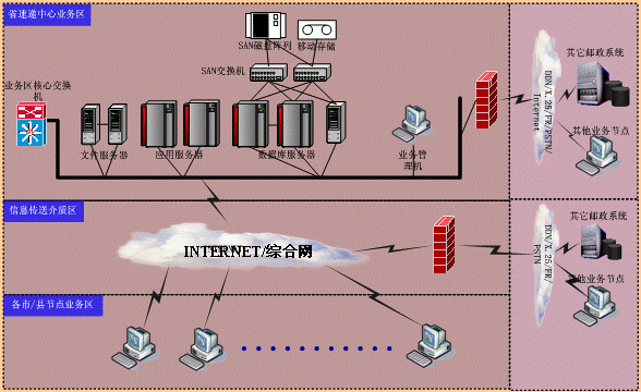(2)INTERNET/郵政綜合網(wǎng):本系統(tǒng)的建設(shè)將緊密結(jié)合現(xiàn)有網(wǎng)絡(luò)覆蓋面廣的資源優(yōu)勢(shì),構(gòu)建起全新一代的互聯(lián)網(wǎng)應(yīng)用。